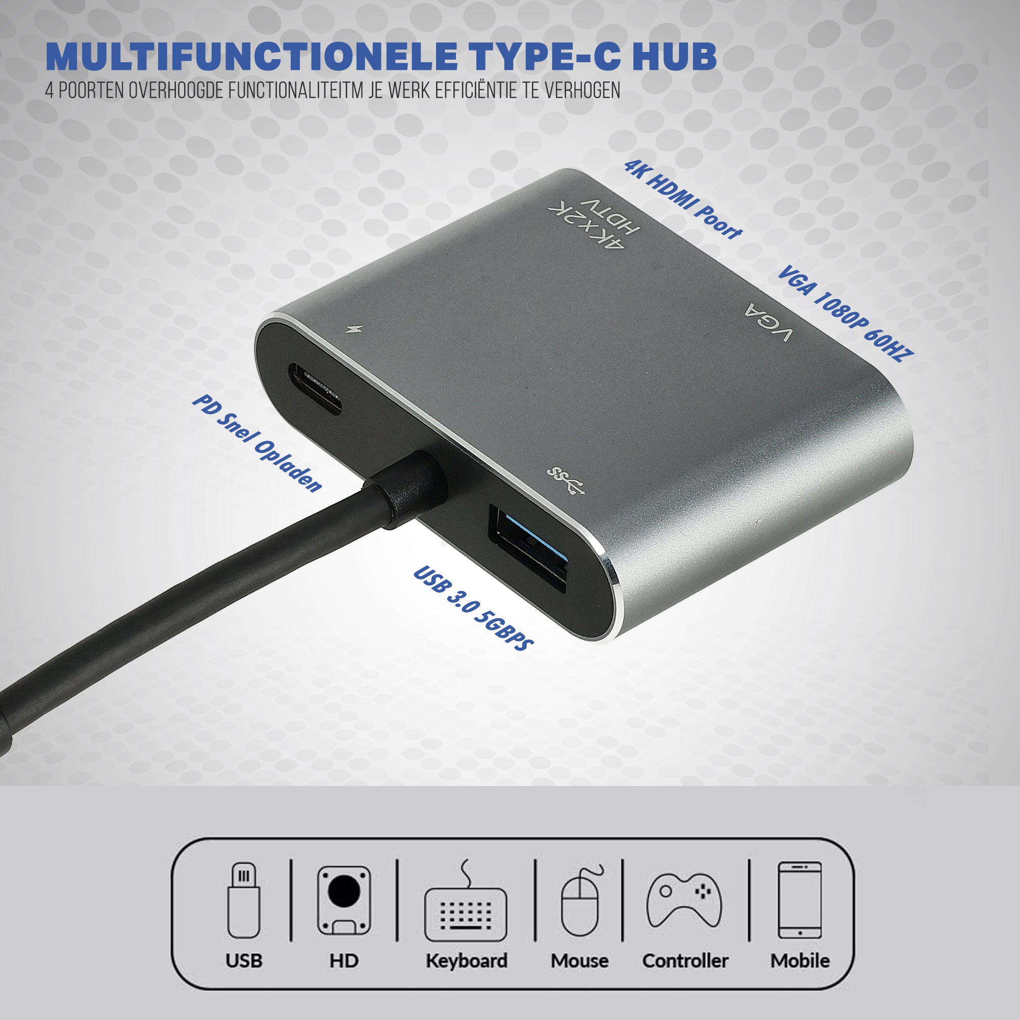 USB-C naar HDMI & VGA Adapter 4-in-1 – Haarscherp 4K Beeld & Supersnelle Connectiviteit