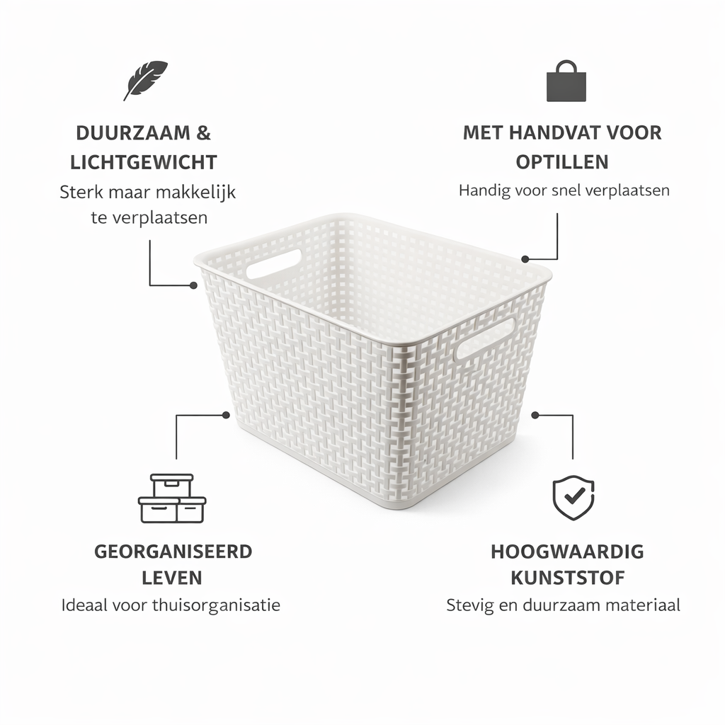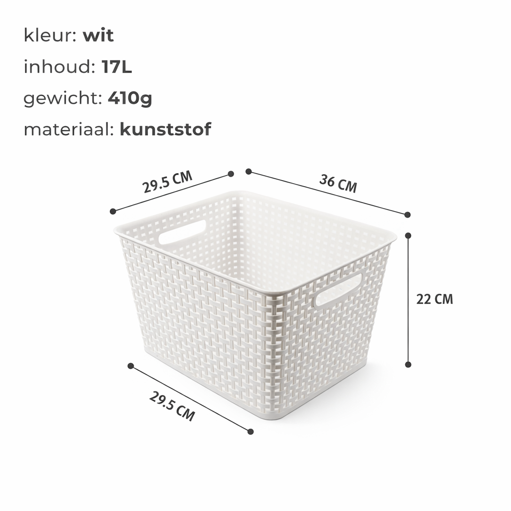 Deze witte kunststof opbergbak van 17 liter helpt bij het organiseren van verschillende ruimtes in huis. Met een formaat van 36 x 29.5 x 22 cm biedt de opbergmand voldoende ruimte voor dagelijkse spullen zonder veel plaats in te nemen.